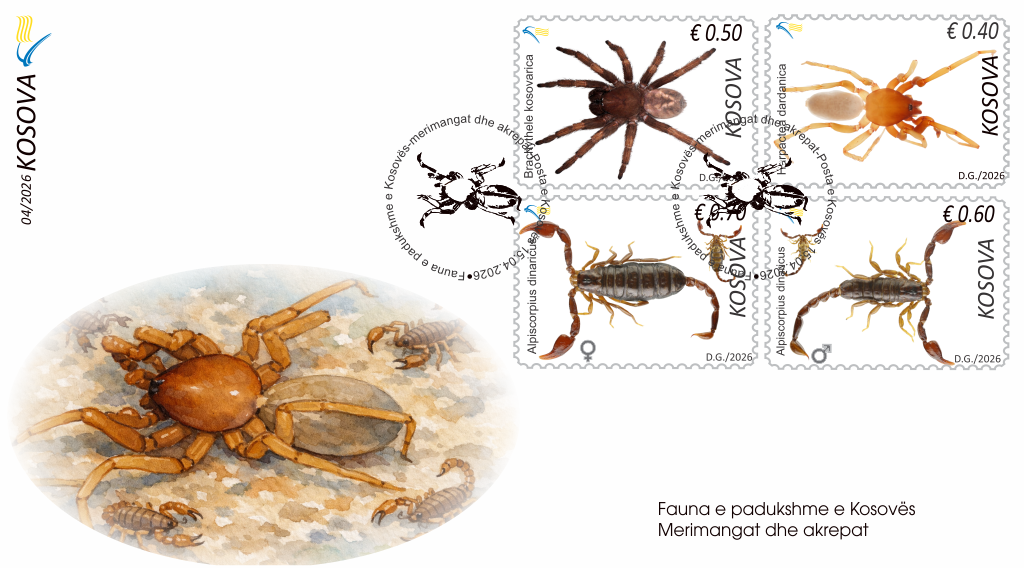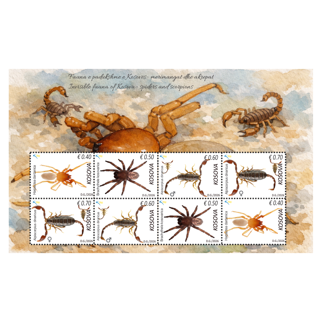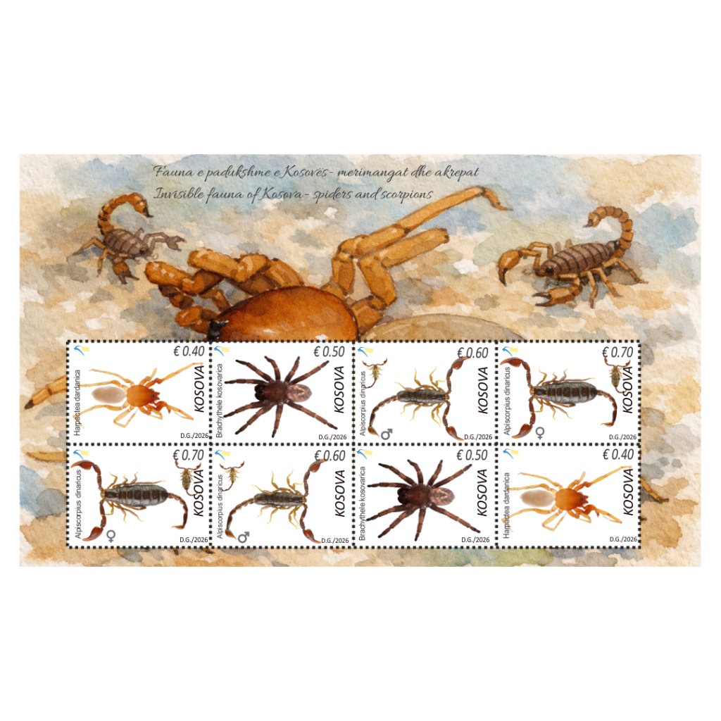 Posta e Kosovës, në bashkëpunim me Fakultetin e Shkencave Matematike-Natyrore/Katedrën e Biologjisë, lansoi sot emisionin e ri të pullave postare “Fauna e padukshme në Kosovë – Merimangat dhe Akrepat”.